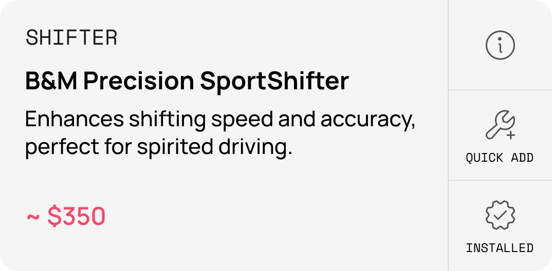 Our AI modification technology represents a shift in how enthusiasts build their dream vehicles. Mia, MOTORMIA’s AI-agent, actively learns from millions of successful builds to provide intelligent recommendations tailored to your specific vehicle and style.