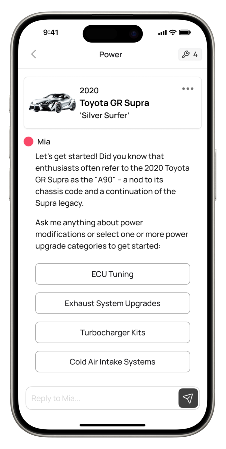 At the heart of MOTORMIA is Mia, your AI-powered modding buddy, pocket mechanic, build researcher, and performance analyst.